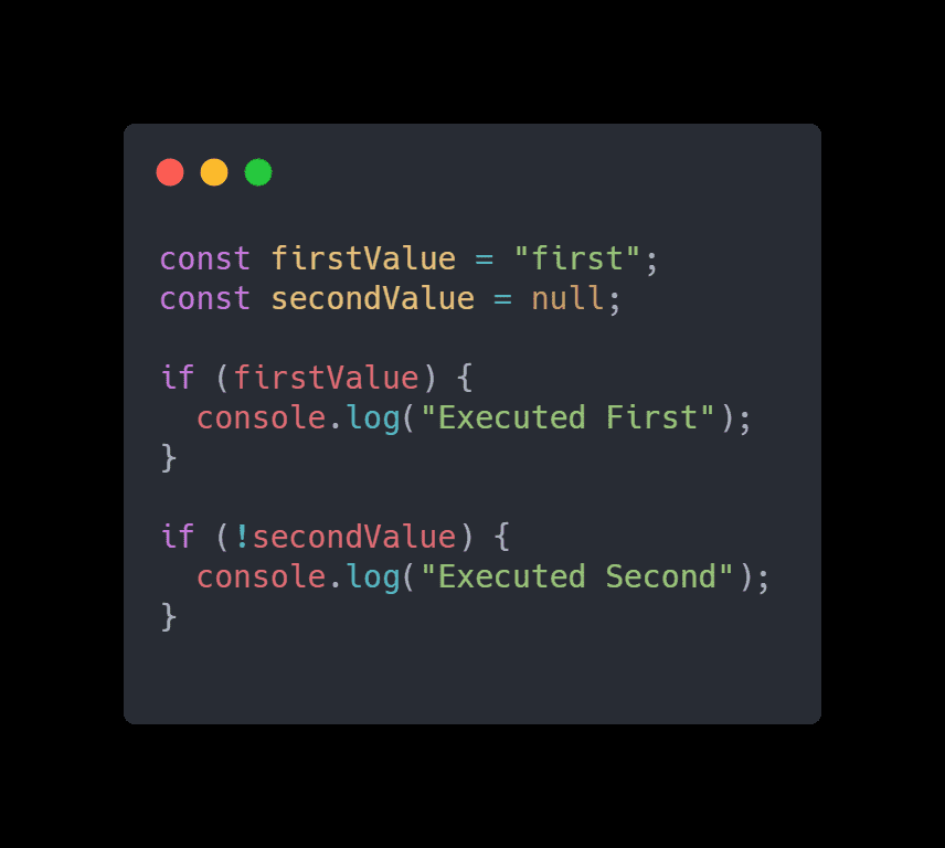 So what happened here as we know if condition statements deal with boolean values. In the first, if block it takes the firstValue and evaluates it as boolean. here it’s a string value which is truthy value in js, and therefore it considers that truthy value and the first block executes. While in the second case secondValue null which is a falsy value it considers that and therefore it is not executed.